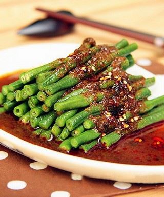 原料:鲜豆角、芝麻酱、精盐、花椒油、姜末适量。